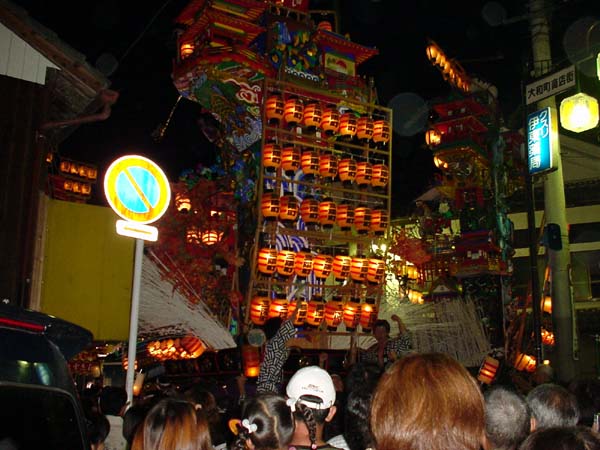 7月21日の夜8時頃・・・。隈・竹田地区の4基が提灯をつけ、壽限無の近くにある「札の辻」に集まり、山鉾同士の晩山の競演が行われました(「札の辻入り」と言われています)。